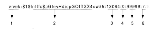 其中最关键的字段是“口令”字段,以“$”作为分隔符,又分为使用算法编号、salt值和加密之后的口令哈希值。