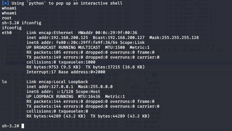 打开shell,通过id查看shell权限账户及其所在的权限组,通过指令whoami发现执行权限是root,使用指令ifconfig可查看靶机的网络