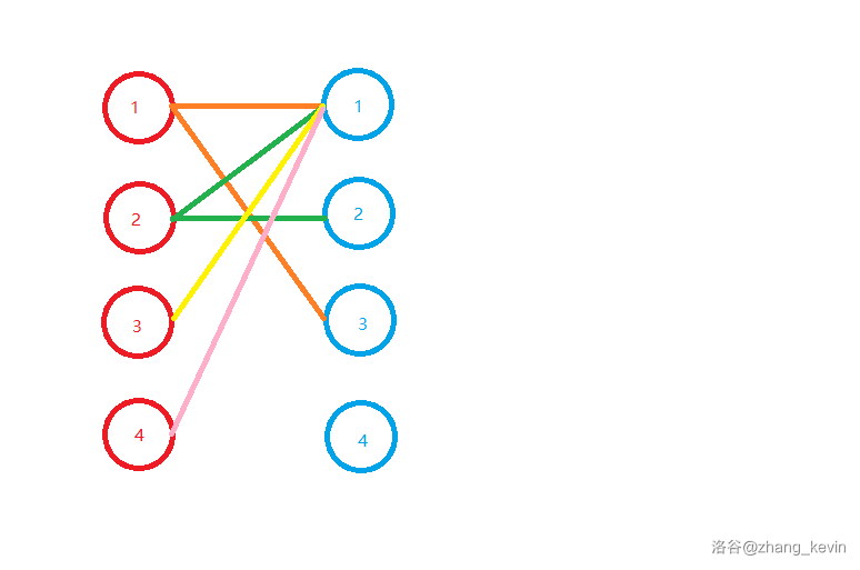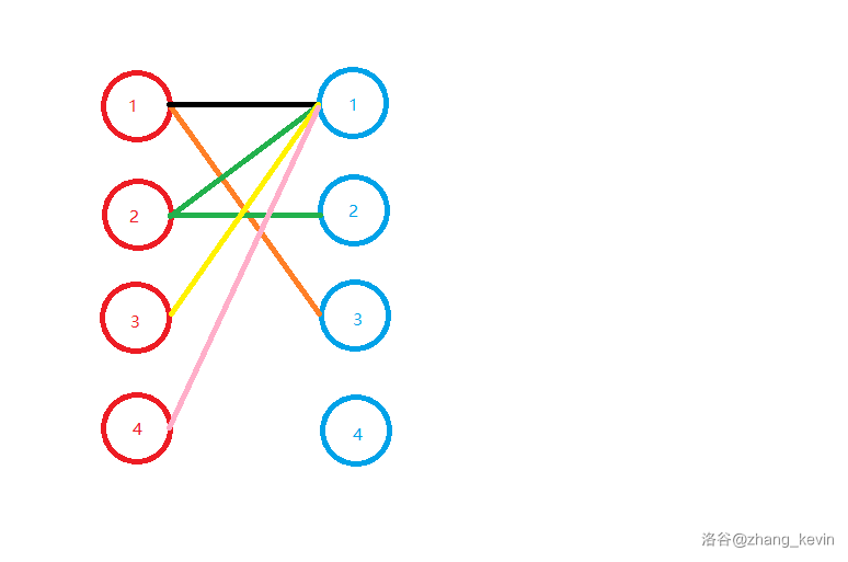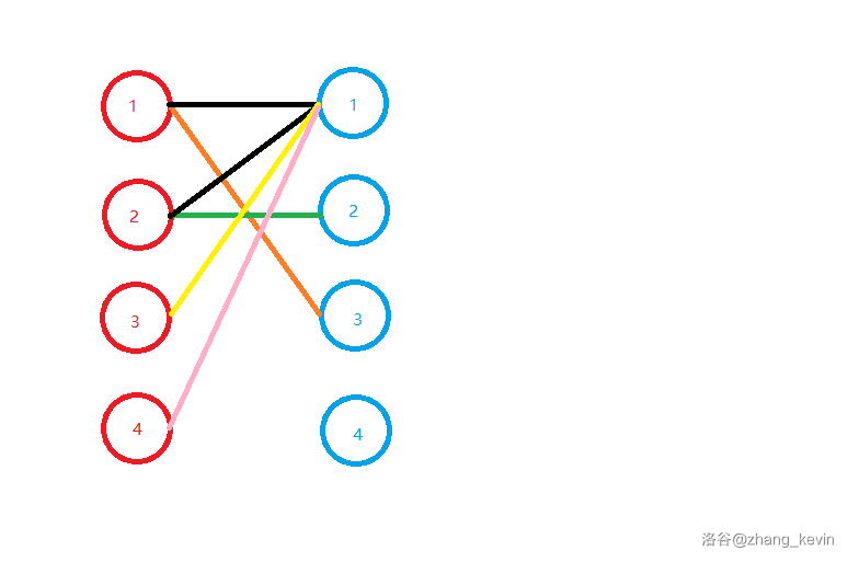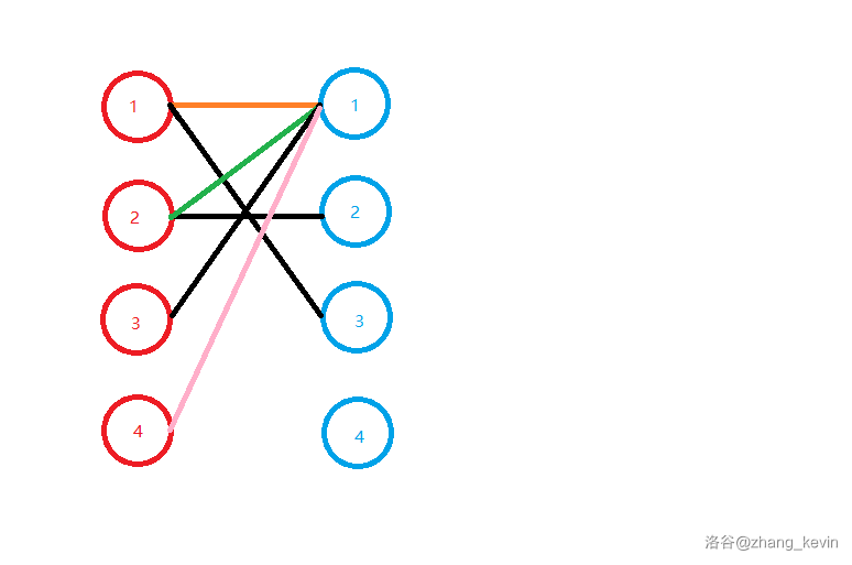 我们称呼左边的点为红 \(1\)、红 \(2\)、红 \(3\)、红 \(4\),称呼右边的点为蓝 \(1\)、蓝 \(2\)、蓝 \(3\)、蓝 \(4\)。