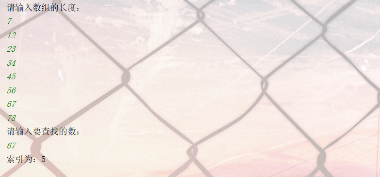 1 import java.util.Scanner; 2 3 public class dichotomy { 4 public static void main(String[] args) { 5 Scanner sc=new Scanner(System.in); 6 System.out.println("请输入数组的长度:"); 7 int a=sc.nextInt(); 8 int arr[]=new int[a]; 9 for(int i=0;i<a;i++){ 10 arr[i]=sc.nextInt(); 11 } 12 System.out.println("请输入要查找的数:"); 13 int value=sc.nextInt(); 14 System.out.println("索引为:"+getIndex(arr,value)); 15 } 16 public static int getIndex(int []arr,int value){ 17 int min=0; 18 int max=arr.length-1; 19 int mid=(max+min)/2; 20 while (value!=arr[(max+min)/2]){ 21 if(value>arr[(max+min)/2]){ 22 min=(max+min)/2+1; 23 } 24 else if(value<arr[(max+min)/2]){ 25 max=(max+min)/2-1; 26 } 27 mid=(max+min)/2; 28 } 29 return mid; 30 } 31 }