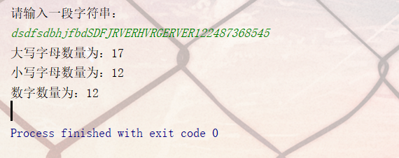 1 import java.util.Scanner; 2 3 //输入一段字符串,输出它里面的大写字母个数,小写字母个数,以及数字的个数 4 public class chazhaozifushu { 5 public static void main(String[] args) { 6 Scanner sc=new Scanner(System.in); 7 System.out.println("请输入一段字符串:"); 8 String s=sc.nextLine(); 9 char [] c=s.toCharArray();//将字符串转换为字符数组 10 int smallCount=0; 11 int bigCount=0; 12 int numCount=0; 13 for(int i=0;i<s.length();i++){ 14 if (Character.isUpperCase(c[i])){ 15 bigCount++; 16 } 17 else if(Character.isLowerCase(c[i])){ 18 smallCount++; 19 }else if(Character.isDigit(c[i])){ 20 numCount++; 21 } 22 } 23 System.out.println("大写字母数量为:"+bigCount); 24 System.out.println("小写字母数量为:"+smallCount); 25 System.out.println("数字数量为:"+numCount); 26 27 } 28 29 }