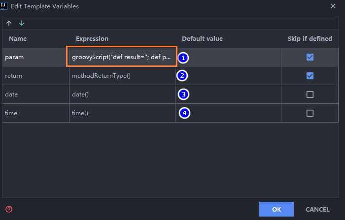 groovyScript("def result=''; def params=\"${_1}\".replaceAll('[\\\\[|\\\\]|\\\\s]', '').split(',').toList(); for(i = 0; i < params.size(); i++) {result+=' * @param ' + params[i] + ((i < params.size() - 1) ? '\\n' : '')}; return result", methodParameters())