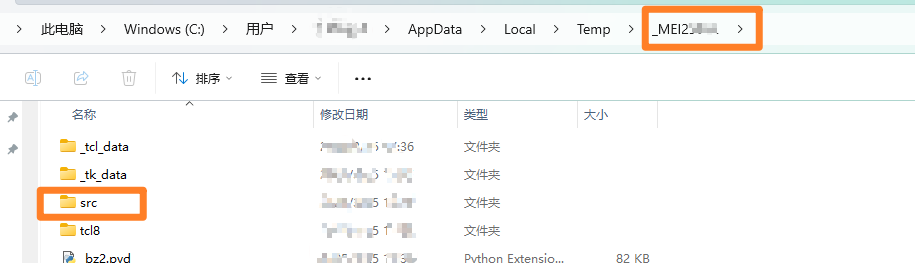 base_dir = sys._MEIPASS是在打包时会分配一个临时文件夹路径给exe文件。运行时会将src放在此临时目录下。执行exe时会访问此路径,如下图