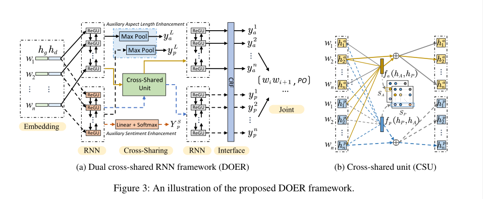 提出了一种新的框架DOER,以端到端的方式解决方面项极性共提取问题。交叉共享单元(CSU)旨在利用两个任务的交互。