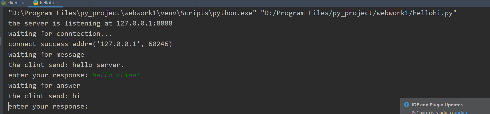 1 import socket 2 3 HOST = '127.0.0.1' 4 PORT = 8888 5 6 server = socket.socket() 7 server.bind((HOST, PORT)) 8 server.listen(1) 9 10 print(f'the server is listening at {HOST}:{PORT}') 11 print('waiting for conntection...') 12 conn, addr = server.accept() 13 14 print(f'connect success addr={addr}') 15 print('waiting for message') 16 while True: 17 msg = conn.recv(1024) 18 print('the clint send:', msg.decode()) 19 response = input('enter your response: ') 20 conn.send(response.encode()) 21 print('waiting for answer')