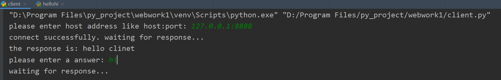 1 import socket 2 import sys 3 4 try: 5 host, port = input('please enter host address like host:port: ').split(':') 6 except ValueError: 7 print('the address is wrong') 8 sys.exit(-1) 9 10 if len(host) == 0 or len(port) == 0: 11 print('the address is wrong') 12 sys.exit(-1) 13 else: 14 client = socket.create_connection((host, int(port))) 15 16 print('connect successfully. waiting for response...') 17 18 client.send(b'hello server.') 19 while True: 20 response = client.recv(1024) 21 print('the response is:', response.decode()) 22 msg = input('please enter a answer: ') 23 client.send(msg.encode()) 24 print('waiting for response...')
