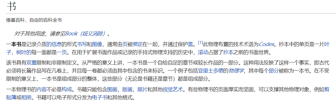 我们要想知道未来的图书是什么样的,首先要了解的是当前的图书到底是什么样的,对比当中的不同我们才能确定图书会朝哪个方向发展,为此我特地到百度百科和维基百科分别查了图书的定义: