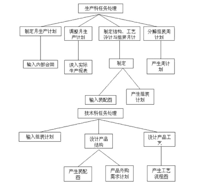 (2)根据组装计划进行产品工艺设计,根据产品自制物料清单产生工艺流程图给零件厂。 试写出以上系统中生产科和技术科处理的软件结构图。