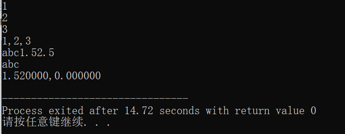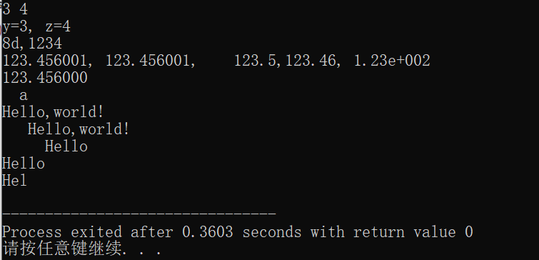 #include<stdio.h> int main(){ int x=1234; float f=123.456; double m=123.456; char ch='a'; char a[]="Hello,world!"; int y=3,z=4; printf("%d %d\n",y,z); printf("y=%d, z=%d\n",y,z); printf("8d,%2d\n",x,x); printf("%f, %8f, %8.1f,%0.2f, %.2e\n",f,f,f,f,f); printf("%lf\n",m); printf("%3c\n",ch); printf("%s\n%15s\n%10.5s\n%2.5s\n%.3s\n",a,a,a,a,a); return 0; }