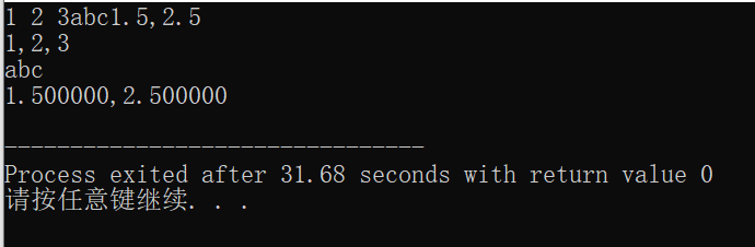 #include<stdio.h> int main(){ double x,y; char c1,c2,c3; int a1,a2,a3; scanf("%d%d%d",&a1,&a2,&a3); printf("%d,%d,%d\n",a1,a2,a3); scanf(" %c %c %c",&c1,&c2,&c3); printf("%c%c%c\n",c1,c2,c3); scanf("%lf,%lf",&x,&y); printf("%lf,%lf\n",x,y); return 0; }