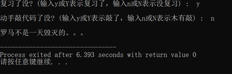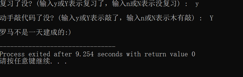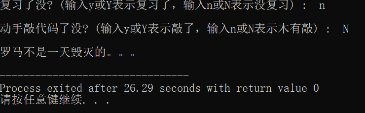 int main() { char ans1, ans2; printf("复习了没? (输入y或Y表示复习了,输入n或N表示没复习) : "); ans1 = getchar(); getchar(); printf("\n动手敲代码了没? (输入y或Y表示敲了,输入n或N表示木有敲) : "); ans2 = getchar(); if(ans1=='y'||ans1=='Y'&&ans2='y'||ans2='Y') printf("\n罗马不是一天建成的:)\n"); else printf("\n罗马不是一天毁灭的。。。\n"); return 0; }
