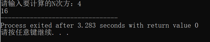 #include<stdio.h> #include<math.h> int main() { int n; unsigned long long sum; printf("请输入要计算的N次方:"); scanf("%d",&n); sum=pow(2,n); printf("%llu",sum); return 0; }