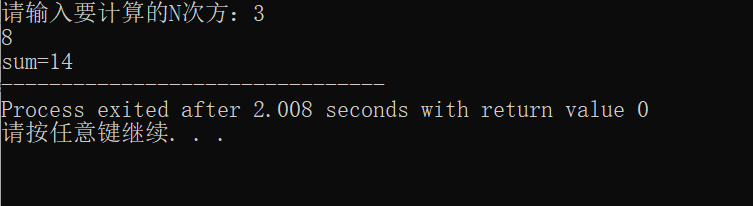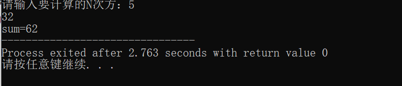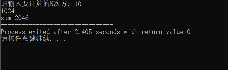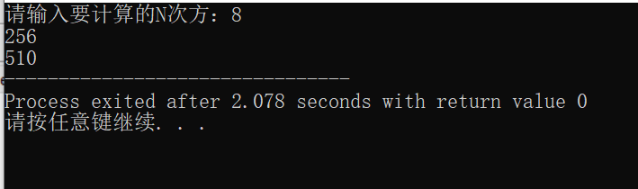 #include<stdio.h> #include<math.h> int main() { int n; unsigned long long sum; printf("请输入要计算的N次方:"); scanf("%d",&n); sum=pow(2,n); printf("%d\n",sum); int s; s=2*sum-2; printf("%d",s); return 0; }