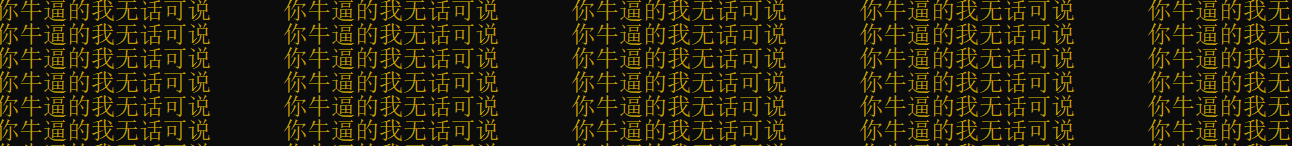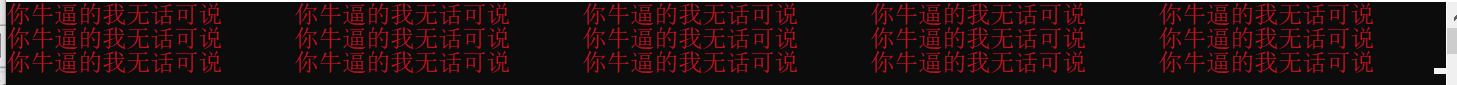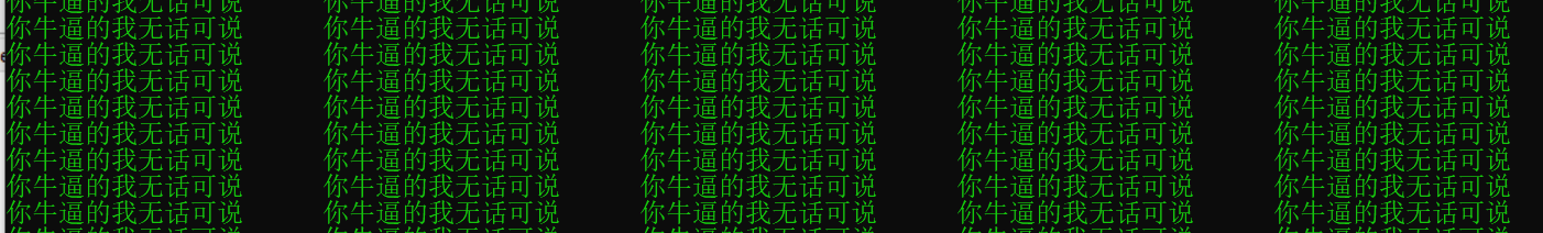 #include<stdio.h> #include<stdlib.h> int main() { int i; for (i = 1; i <= 250;) { system("color 1"); system("color 2"); system("color 3"); system("color 4"); system("color 5"); system("color 6"); system("color a"); printf("你牛逼的我无话可说\t"); i = i + 0.03125; } return 0; }