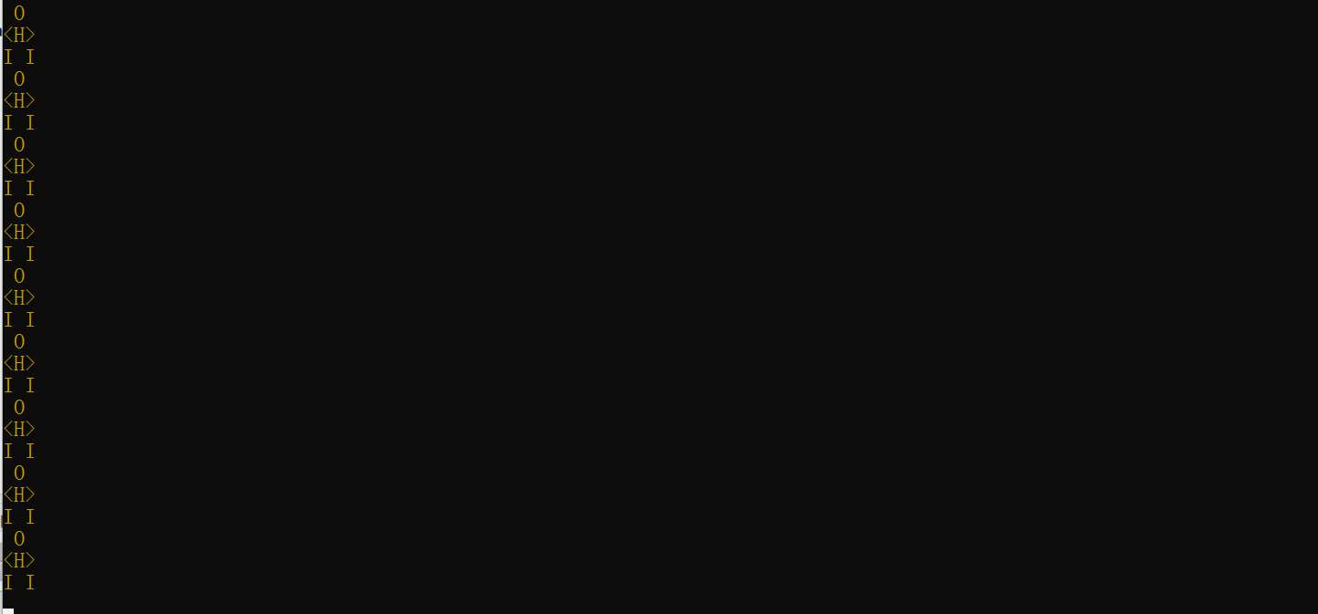 #include <stdio.h> #include <stdlib.h> #include <windows.h> int main() { int i; int a, b; a = 0; for (i = 1; i <= 250;i = i + 0.03125) { a=0; while (a <= 80) { system("color 1"); system("color 2"); system("color 3"); system("color 4"); system("color 5"); system("color 6"); system("color a"); system("cls"); b = 1; while (b <= a) { printf(" "); b = b + 1; } printf(" O\n"); b = 1; while (b <= a) { printf(" "); b = b + 1; } printf("<H>\n"); b = 1; while (b <= a) { printf(" "); b = b + 1; } printf("I I\n"); Sleep(300); a = a + 1; } } return 0; }