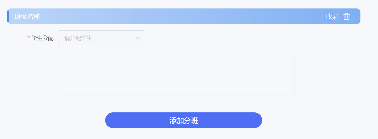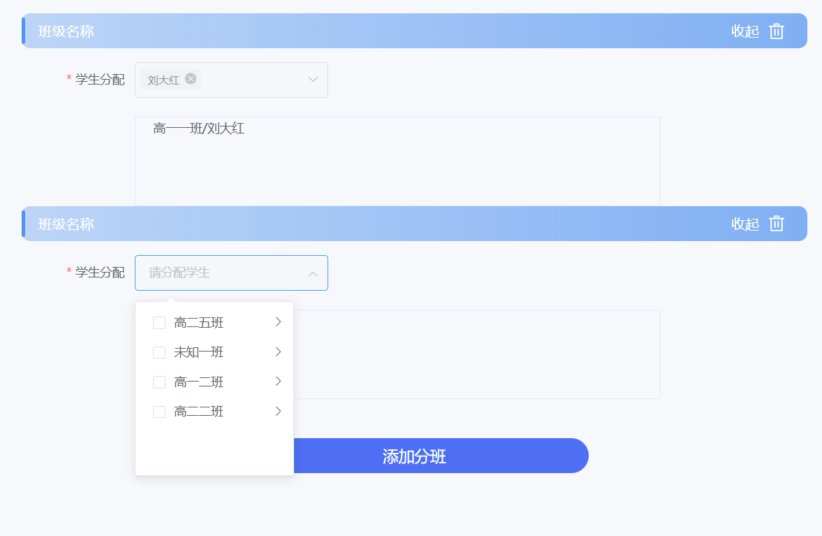 - 下图点击添加分班会创建一个新班级,前一个班的学生不能出现在其他班级中(如把一堆苹果分别装到多个篮子里分一个少一个,可以把篮子里的苹果拿出来)