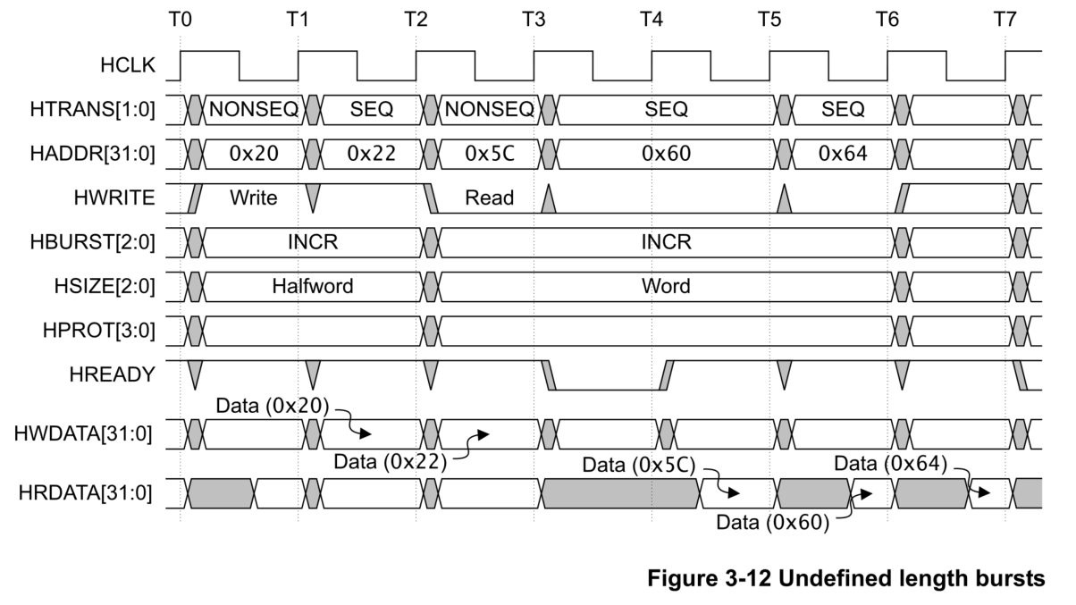 如上图是一个AHB 传输BURST类型是未定义的自增传输(INCR)的时序图,AHB每次传输分为两个阶段,地址阶段和数据阶段,可以流水线(在上次传输的数据阶段直接断言下次的地址阶段)