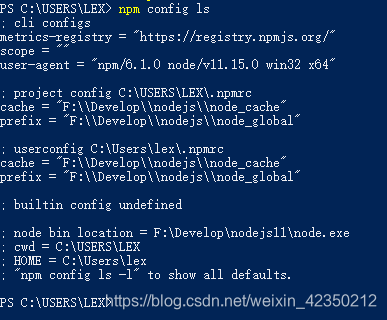 默认的安装路径:查看本机配置文件C:\Users\lex\.npmrc文件
