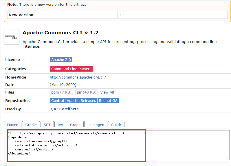 在maven仓库中,http://mvnrepository.com/artifact/commons-cli/commons-cli/1.2;搜索对应的版本的commons-cli然后出现下图的