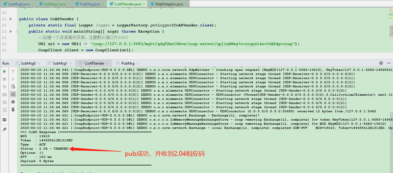 3、java连接emqx-coap,因为只能使用PUT请求,代码中注释的部分,是另外两种发送CoAP-PUT请求的例子,经测试都是可用的;