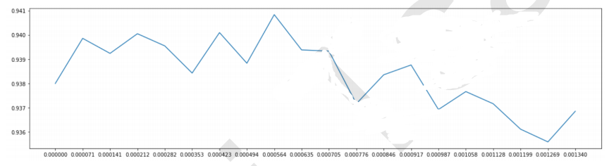 查看结果,果然0.00067并不是最高点,真正的最高点0.000564已经将模型效果提升到了94%以上。我们使用