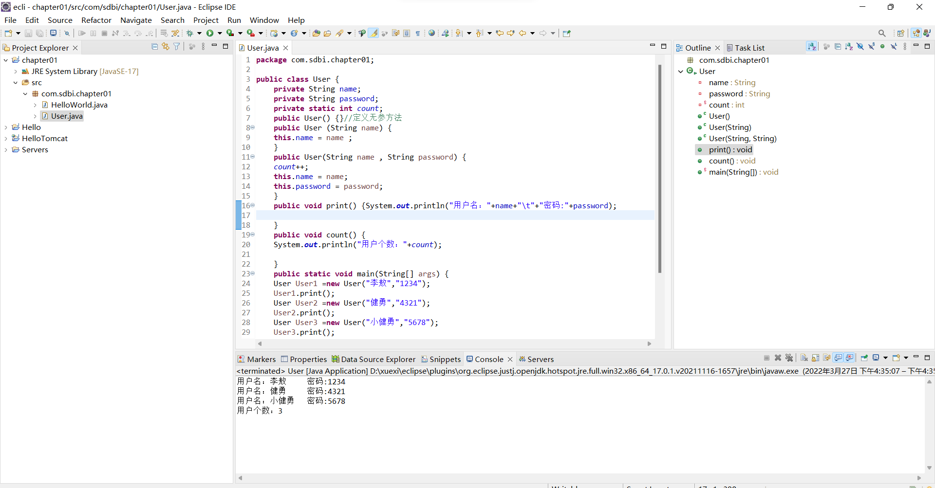设计一个用户类User,类中的变量有用户名、密码和记录用户数量的变量,定义3个构造方法:无参的、为用户名赋值的、为用户名和密码赋值的,还有获取和设置密码的方法和返回类信息的方法。