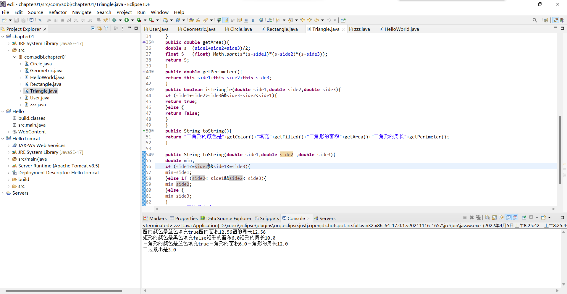 ⑧一个名为toString()的方法,返回三边较小的字符串描述。