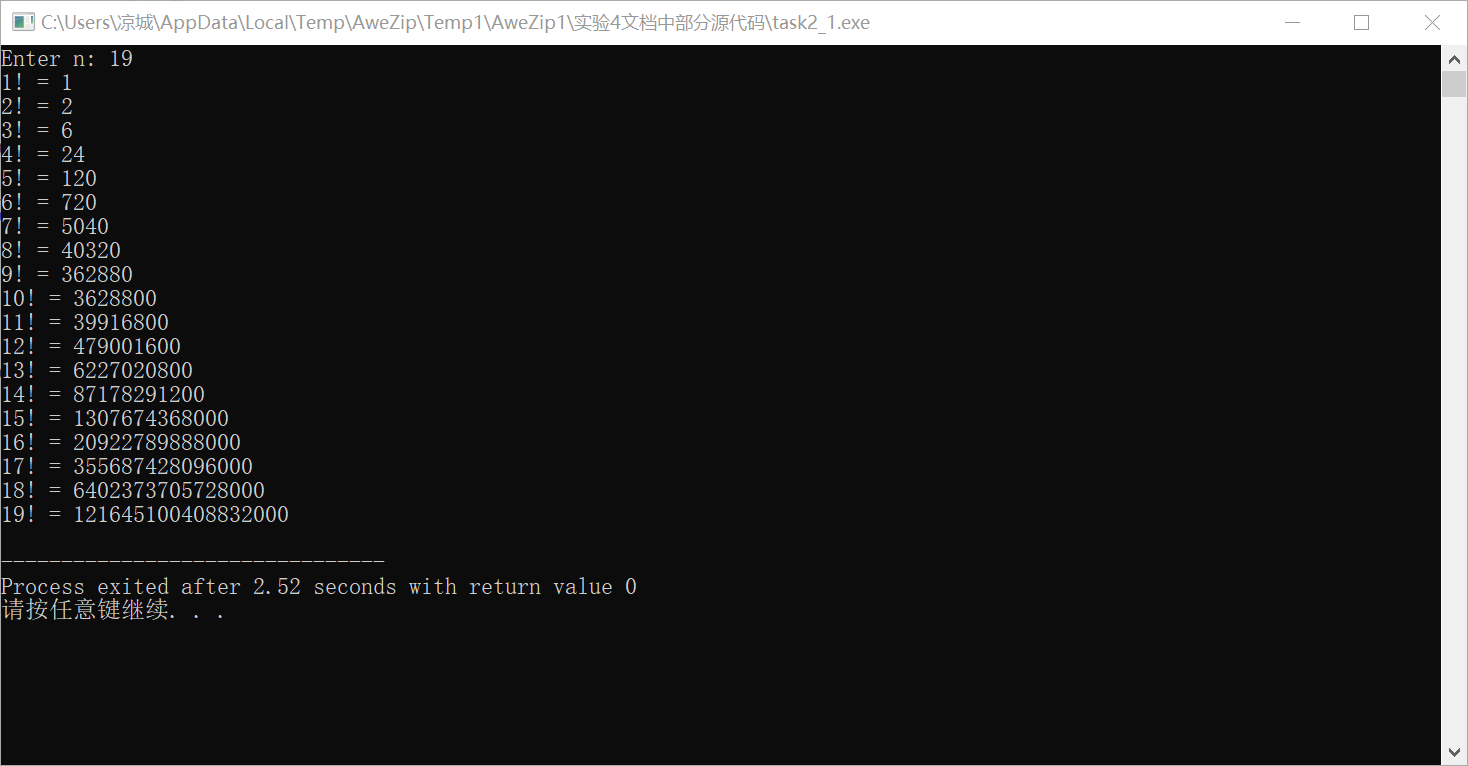 printf("%d! = %lld\n", i, fac(i));