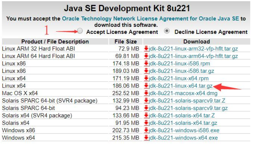 - .点击链接 https://www.oracle.com/technetwork/java/javase/downloads/jdk8-downloads-2133151.html ,同意协议往下拉一点,然后就可以看到如图效果并根据箭头所指来下载(因为我是下载的centos_8_2_x64,所以我下载的是Linux版本)。