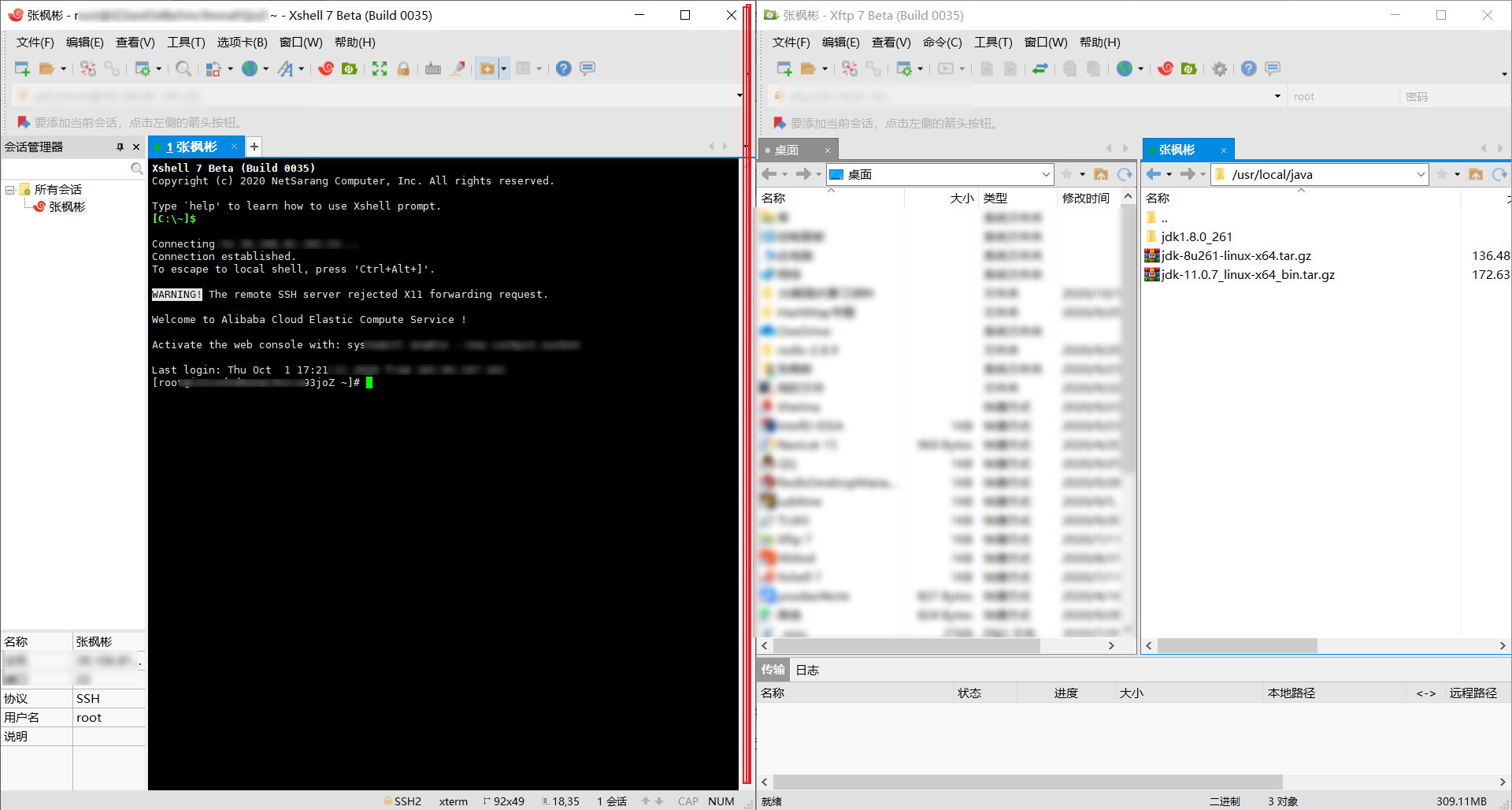 在下载好之后,打开xftp、xshell并输入用户名和密码连接阿里云服务器,界面如下(右xftp,左xshell):