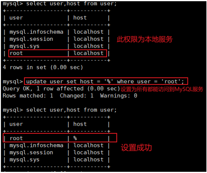 update user set host = '%' where user = 'root';