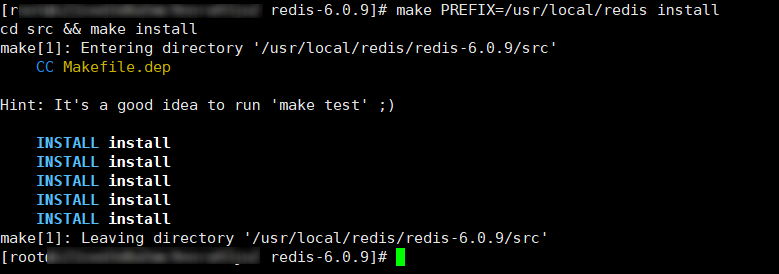 这里多了一个关键字 PREFIX= 这个关键字的作用是编译的时候用于指定程序存放的路径,会在根目录外层生成一个bin目录。比如我们现在就是指定了redis必须存放在/usr/local/redis目录。假设不添加该关键字Linux会将可执行文件存放在/usr/local/bin目录,