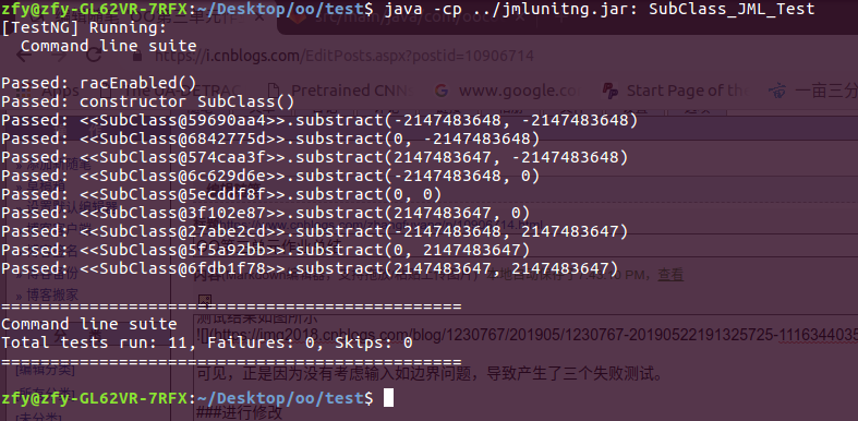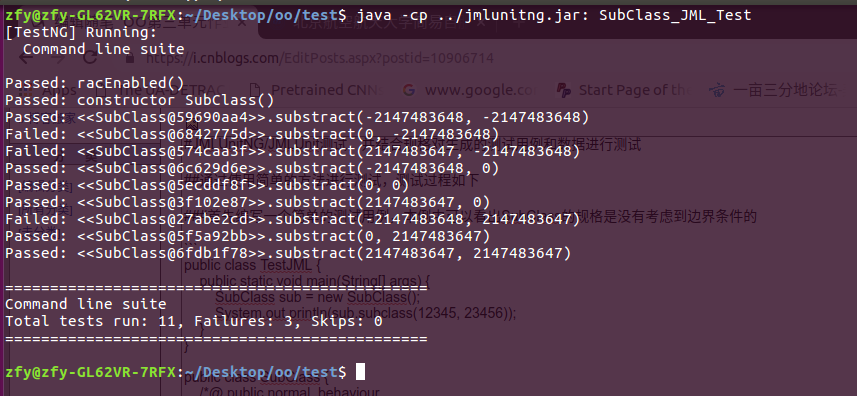 通过 java -jar jmlunitng.jar test/TestJML.java test/SubClass.java生成测试文件,通过javac -cp jmlunitng.jar test/TestJML.java test/SubClass.java 和 openjml -rac test/TestJML.java test/SubClass.java命令进行编译。
