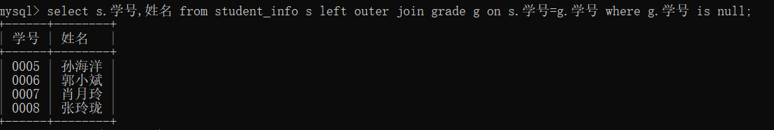 select s.学号,姓名 from student_info s left outer join grade g on s.学号=g.学号 where g.学号 is null;