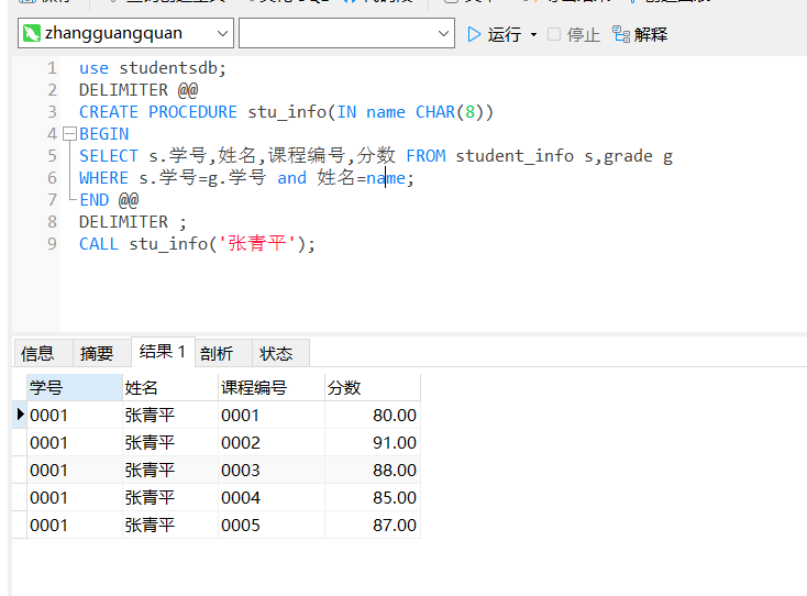 DELIMITER @@ CREATE PROCEDURE stu_info(IN name CHAR(8)) BEGIN SELECT s.学号,姓名,课程编号,分数 FROM student_info s,grade g WHERE s.学号=g.学号 and 姓名=name; END @@ 使用CALL命令执行存储过程stu_info,其参数值为'张青平'。 DELIMITER ; CALL stu_info('张青平');