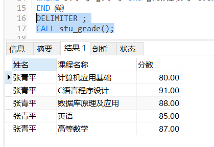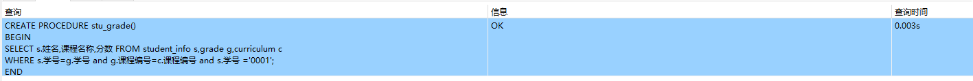 DELIMITER @@ CREATE PROCEDURE stu_grade() BEGIN SELECT s.姓名,课程名称,分数 FROM student_info s,grade g,curriculum c WHERE s.学号=g.学号 and g.课程编号=c.课程编号 and s.学号 ='0001'; END @@