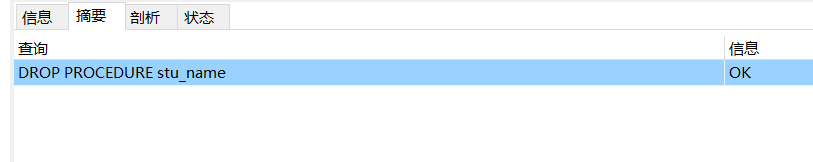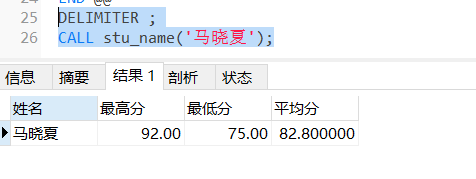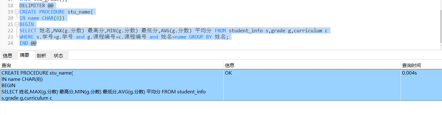 DELIMITER @@ CREATE PROCEDURE stu_name( IN name CHAR(8)) BEGIN SELECT 姓名,MAX(g.分数) 最高分,MIN(g.分数) 最低分,AVG(g.分数) 平均分 FROM student_info s,grade g,curriculum c WHERE s.学号=g.学号 and g.课程编号=c.课程编号 and 姓名=name GROUP BY 姓名; END @@