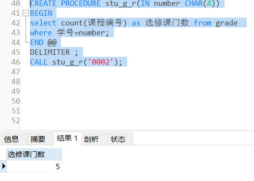DELIMITER @@ CREATE PROCEDURE stu_g_r(IN number CHAR(4)) BEGIN select count(课程编号) as 选修课门数 from grade where 学号=number; END @@ DELIMITER ; CALL stu_g_r('0002');