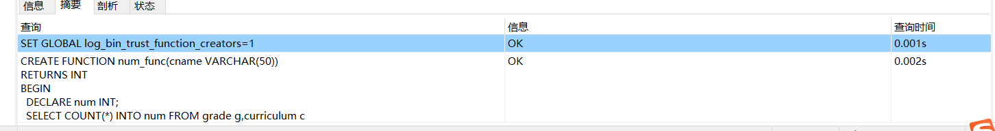SET GLOBAL log_bin_trust_function_creators=1; DELIMITER @@ CREATE FUNCTION num_func(cname VARCHAR(50)) RETURNS INT BEGIN DECLARE num INT; SELECT COUNT(*) INTO num FROM grade g,curriculum c WHERE g.课程编号=c.课程编号 AND c.课程名称=cname; RETURN num; END @@