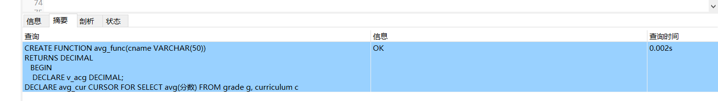 DELIMITER @@ CREATE FUNCTION avg_func(cname VARCHAR(50)) RETURNS DECIMAL BEGIN DECLARE v_acg DECIMAL; DECLARE avg_cur CURSOR FOR SELECT avg(分数) FROM grade g, curriculum c WHERE g.课程编号 = c.课程编号 AND 课程名称 = cname; OPEN avg_cur; FETCH avg_cur INTO v_acg; CLOSE avg_cur; RETURN v_acg; END @@