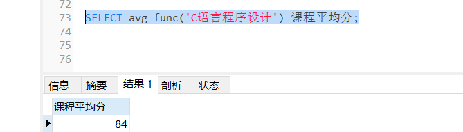 SELECT avg_func('C语言程序设计') 课程平均分;