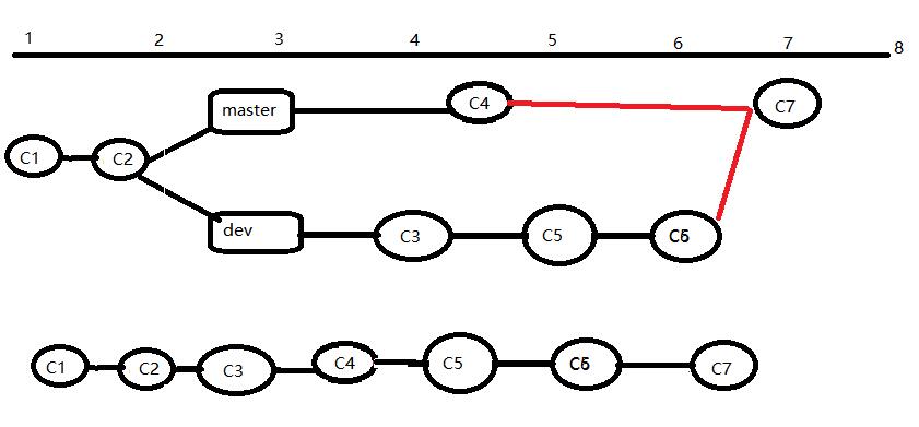 2. 将 dev和master最新一次commit合并生成一个新的commit,此处为 C4和C6生成C7(此步骤有冲突需先解决冲突)