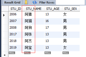 insert into STUDENT values(2019,'阿宝',13,'女');