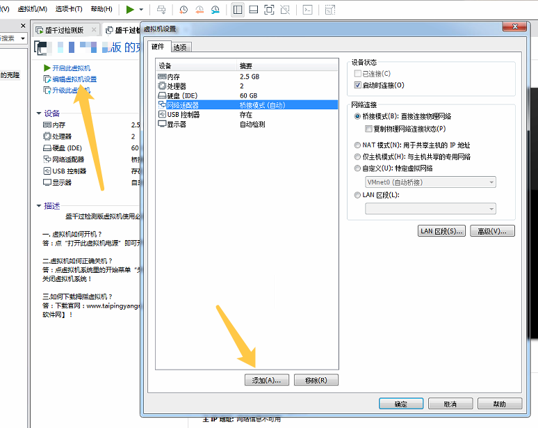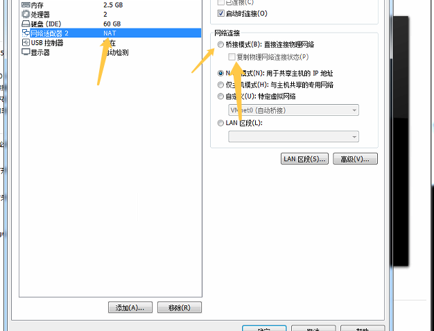 选择第一一个网络适配器,点移除。第二个可以更改为桥接模式