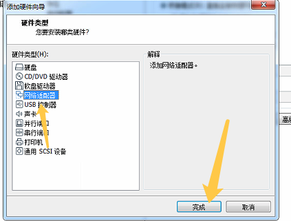 点击添加弹出的窗口中选择网络适配器,然后完成