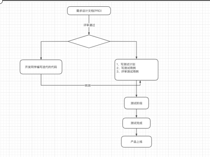 需求评审(PRD 需求设计文档)评审通过分2个部分 1个是开发写代码 一个是 测试部门也测试计划 写测试用例 然后审评测试用例 然后开发转侧(开发转侧之前 需要对代码进行冒烟测试)2个一起开始测试 测试完成 产品上线