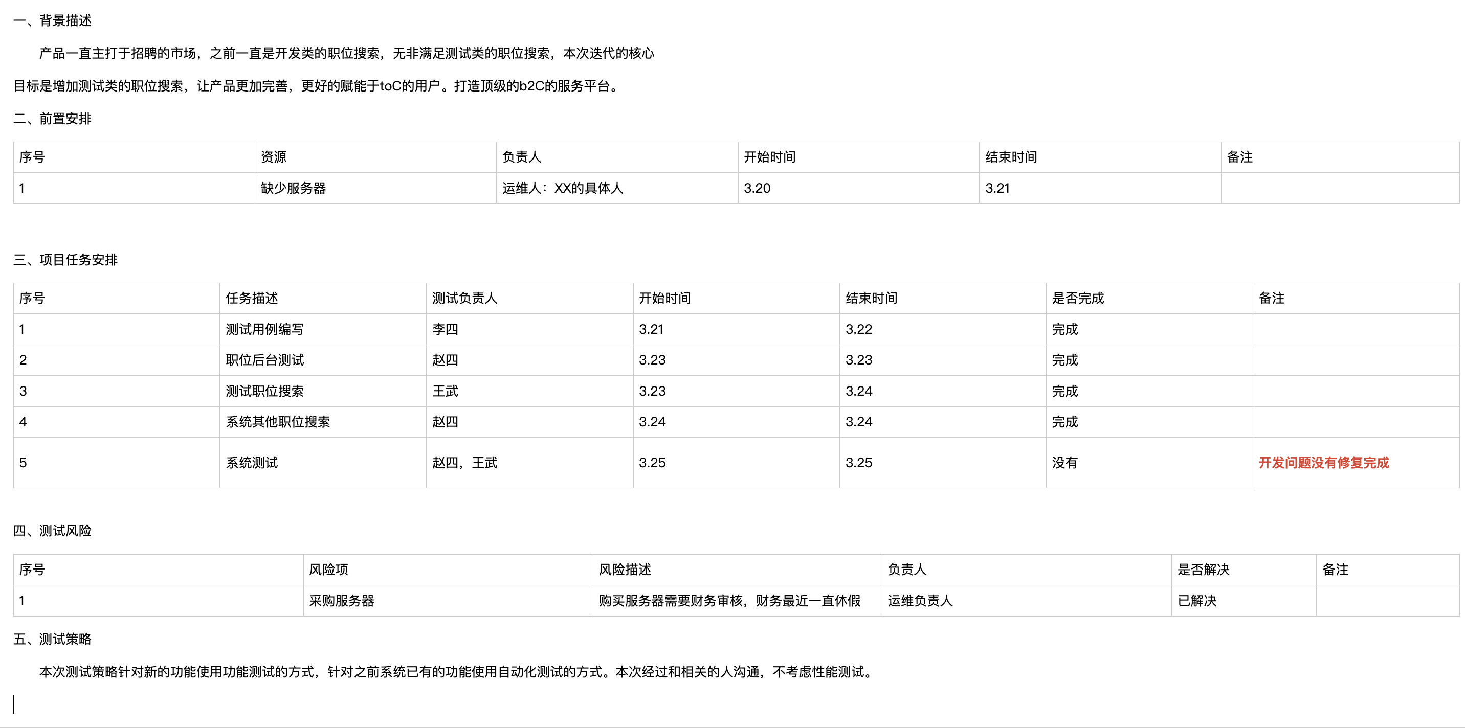 进度安排 在明确测试范围、方法和人员之后,我们要考虑什么时候开始测试,预计要测试多久?以便和开发计划、上线计划衔接。