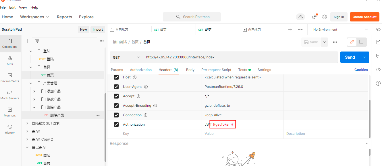 到Postman 再复制这个到Headers 后面的token由于是个变量 所以不能加上 要交动态的{{变量名}}如图,jwt后面有个空格