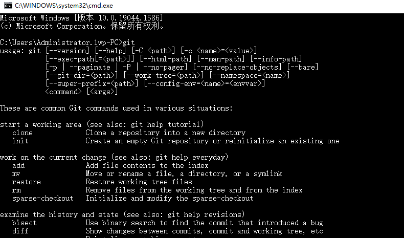 4、在控制台中输入git,出现如图就安装配置没有问题