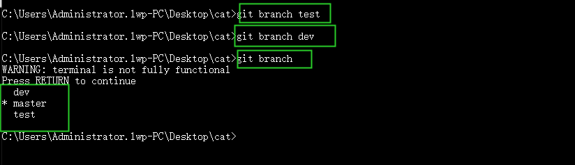 创建以后 然后再查看当前分支的话 这个会显示所有的分支 星号所指的分支就是当前的分支